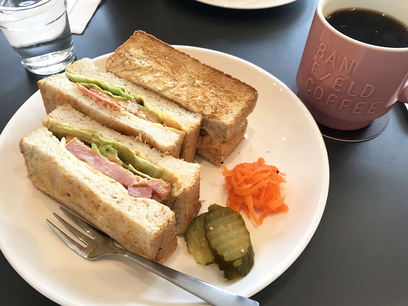 本日のおすすめサンドイッチとベーコンサンドとコーヒーのセットを注文。