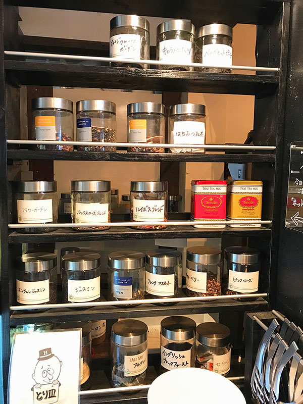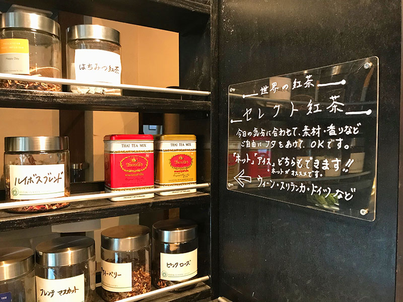 サラダバーの横にたくさんの紅茶がディスプレイされています。