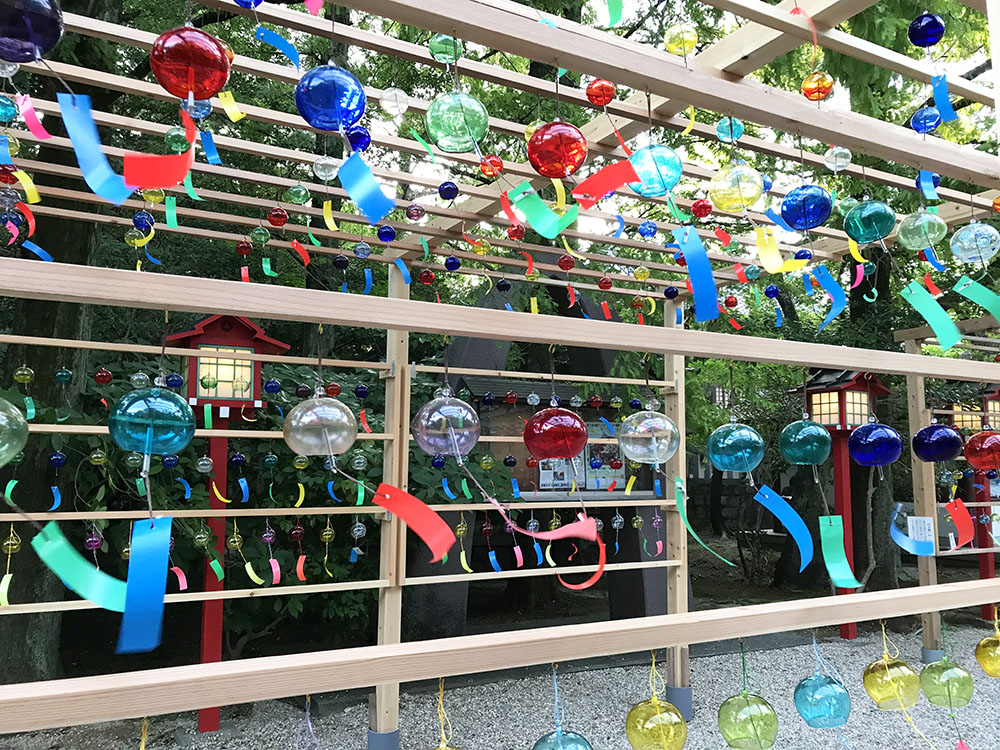 7月のある日、市原神社の近くを通りかかるとたくさんのカラフルな風鈴が飾ってありました。音色がとても涼しげです。